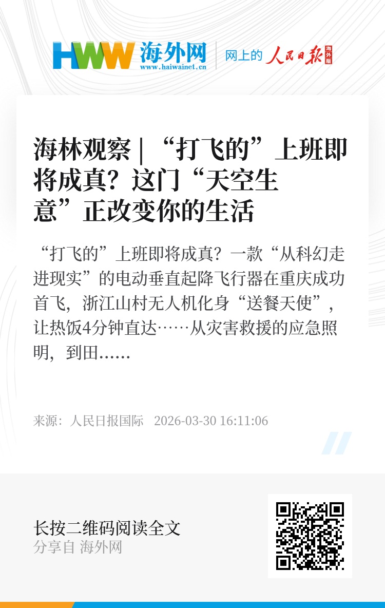 “打飞的”上班即将成真?一款“从科幻走进现实”的电动垂直起降飞行器在重庆成功首飞,浙江山村无人机化身“送餐天使”,让热饭4分钟直达……从灾害救援的应急照明,到田间地头的作物搬运,再到电网巡检、海上作业,中国低空经济正悄然起飞。新的天空故事已经开篇,而这一次,中国不仅是参与者,更是“握笔人”。本期海林观察,带你解读低空经济版图。