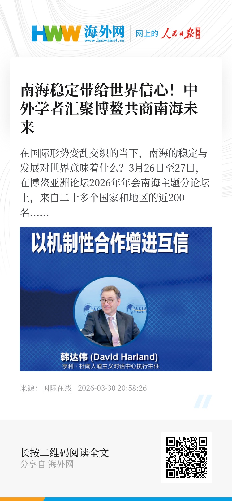 3月26日至27日,在博鳌亚洲论坛2026年年会南海主题分论坛上,来自二十多个国家和地区的近200名专家学者、政府官员和企业代表,对上面的问题展开深入探讨。