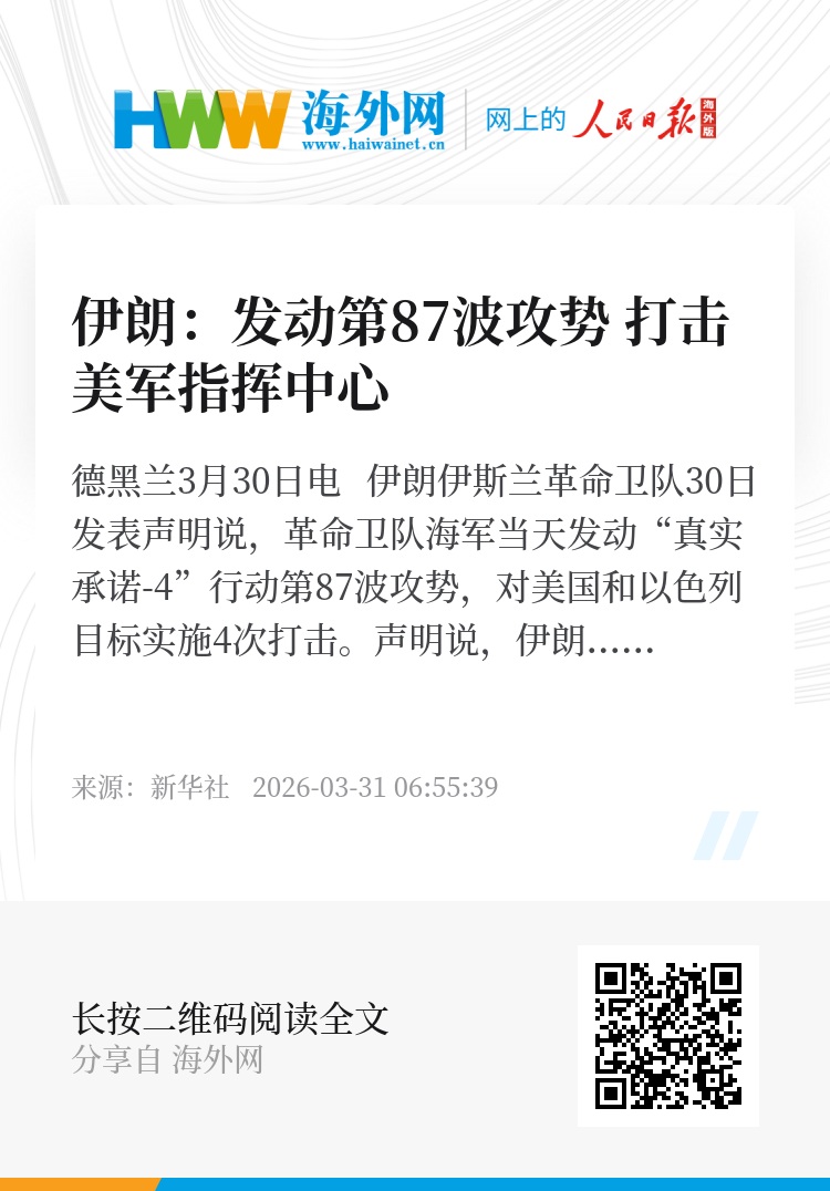 新华社德黑兰3月30日电 伊朗伊斯兰革命卫队30日发表声明说,革命卫队海军当天发动“真实承诺-4”行动第87波攻势,对美国和以色列目标实施4次打击。