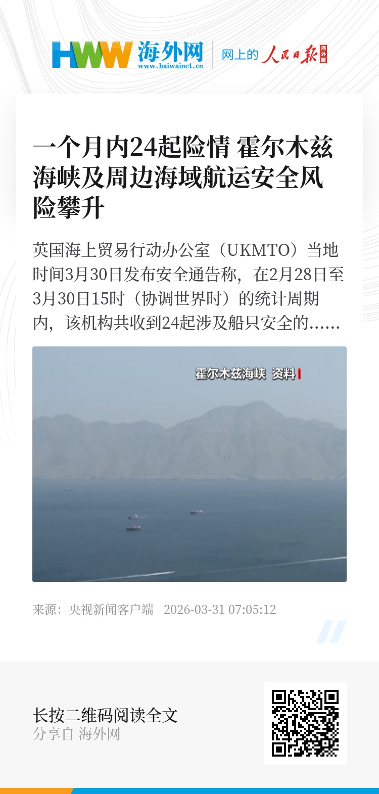 英国海上贸易行动办公室(UKMTO)当地时间3月30日发布安全通告称,在2月28日至3月30日15时(协调世界时)的统计周期内,该机构共收到24起涉及船只安全的事件报告。相关事件主要发生在波斯湾、霍尔木兹海峡以及阿曼湾海域。
