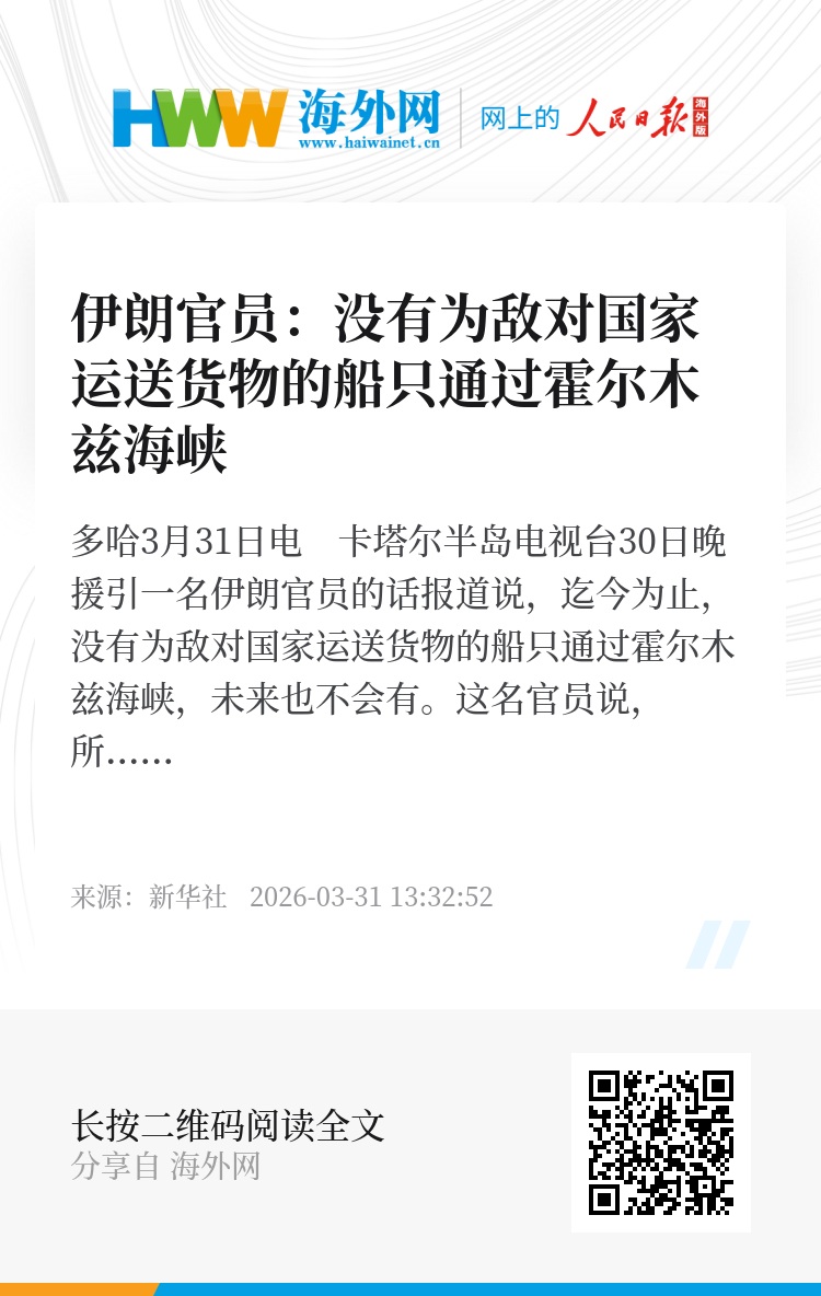 新华社多哈3月31日电 卡塔尔半岛电视台30日晚援引一名伊朗官员的话报道说,迄今为止,没有为敌对国家运送货物的船只通过霍尔木兹海峡,未来也不会有。