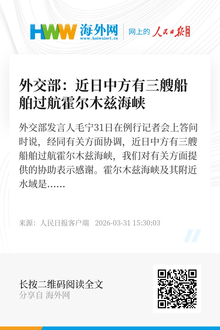 外交部发言人毛宁31日在例行记者会上答问时说,经同有关方面协调,近日中方有三艘船舶过航霍尔木兹海峡,我们对有关方面提供的协助表示感谢。霍尔木兹海峡及其附近水域是重要的国际货物和能源贸易通道,中方呼吁尽快停火止战,恢复海湾地区和平稳定。