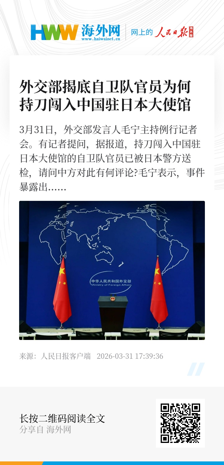 3月31日,外交部发言人毛宁主持例行记者会。有记者提问,据报道,持刀闯入中国驻日本大使馆的自卫队官员已被日本警方送检,请问中方对此有何评论?