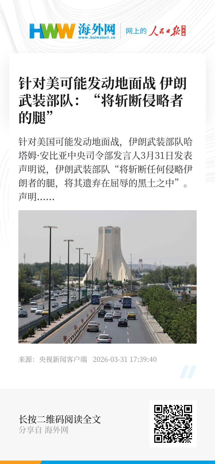 针对美国可能发动地面战,伊朗武装部队哈塔姆·安比亚中央司令部发言人3月31日发表声明说,伊朗武装部队“将斩断任何侵略伊朗者的腿,将其遗弃在屈辱的黑土之中”。