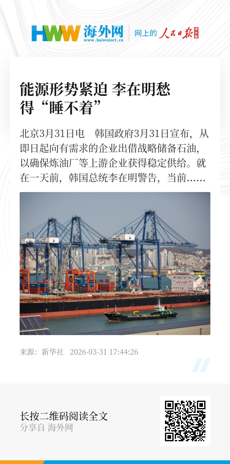 新华社北京3月31日电 韩国政府3月31日宣布,从即日起向有需求的企业出借战略储备石油,以确保炼油厂等上游企业获得稳定供给。就在一天前,韩国总统李在明警告,当前能源形势可能比预期更严峻,自己因此“睡不着觉”。