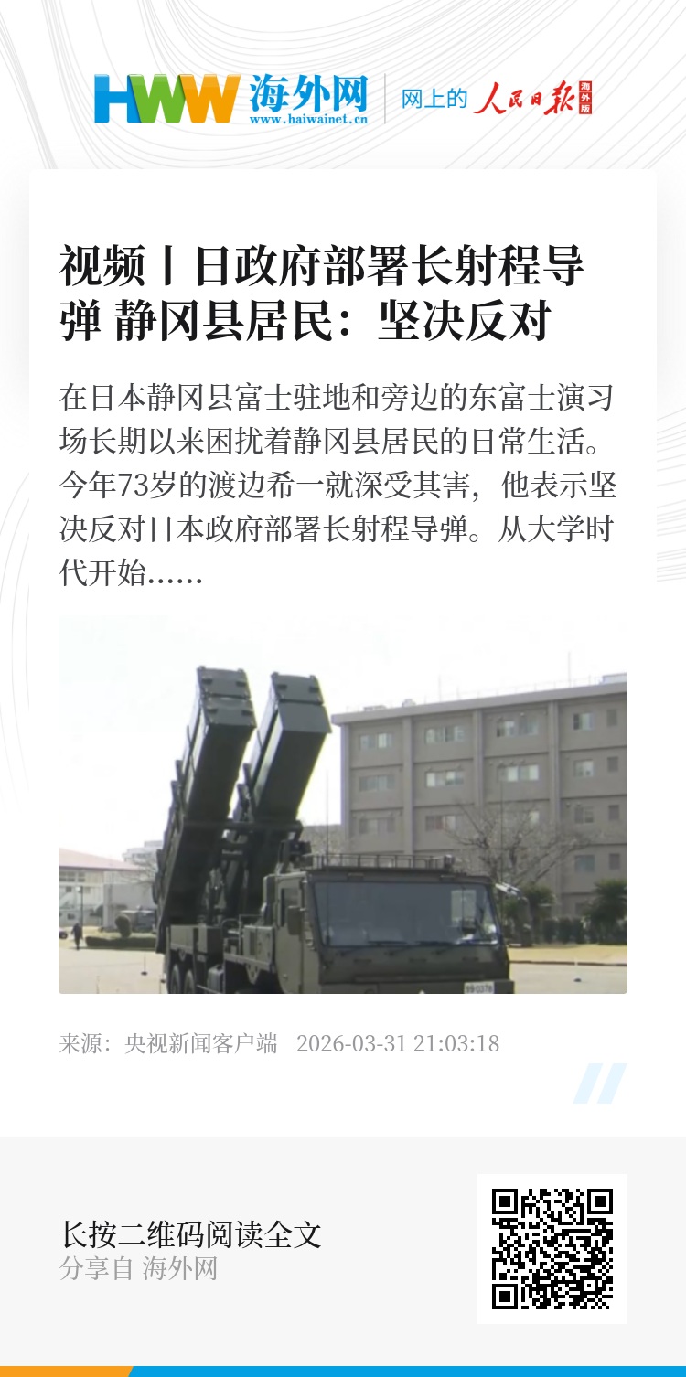 静冈县和平委员会副理事长 渡边希一:一旦部署导弹、发射导弹,被攻击的国家肯定会报复、肯定会朝这里打回来。如果有人说“把导弹部署在富士驻地是好事”,那日本就会变成一个“导弹列岛”,到处都会部署导弹。正因为这是导弹部署的最初阶段,如果不去表达反对的声音、表达应该停止导弹部署的声音,那不就等于默默接受了吗?所以我认为第一步最重要。