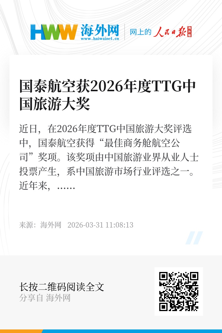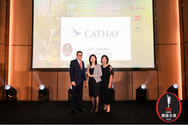 近日,在2026年度TTG中国旅游大奖评选中,国泰航空获得“最佳商务舱航空公司”奖项。该奖项由中国旅游业界从业人士投票产生,系中国旅游市场行业评选之一。