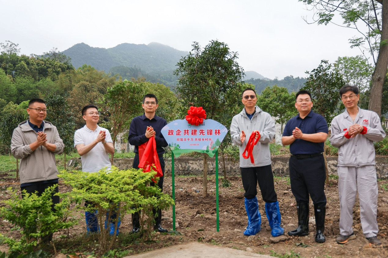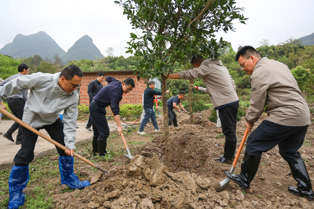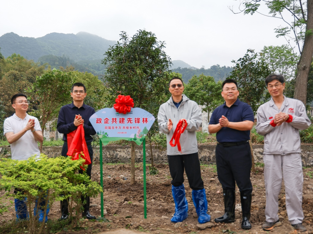 随后,领导嘉宾共同为“政企共建先锋林”揭牌,以“党建红”引领“生态绿”,持续推动政企深化合作,进一步凝聚政企同心、共促发展的合力,共绘绿美生态新画卷。连南县委书记刘新茂对广东宏大走进乡村绿化植树、助力瑶乡实现民生添富和乡村添美等事业发展的大力支持表示感谢。他表示,连南县委县政府将继续深化与广东宏大的战略合作,共同守护好绿水青山,为建设绿美广东作出更大贡献。广东宏大党委书记、董事长郜洪青表示,作为省属国有企业,广东宏大始终铭记使命担当,主动融入绿美广东生态建设大局,此次植树活动正是广东宏大与连南深化“百千万工程”战略合作的具体实践。展望未来,广东宏大将进一步以“百千万工程”为牵引,以党建引领绿色发展,持续厚植瑶乡生态底色,擦亮民生成色,提升乡村亮色,为绿美广东生态建设和广东高质量发展贡献宏大力量。