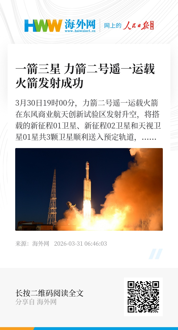 3月30日19时00分,力箭二号遥一运载火箭在东风商业航天创新试验区发射升空,将搭载的新征程01卫星、新征程02卫星和天视卫星01星共3颗卫星顺利送入预定轨道,飞行试验任务取得圆满成功。此次任务是力箭二号运载火箭的首次飞行。图源:视觉中国
