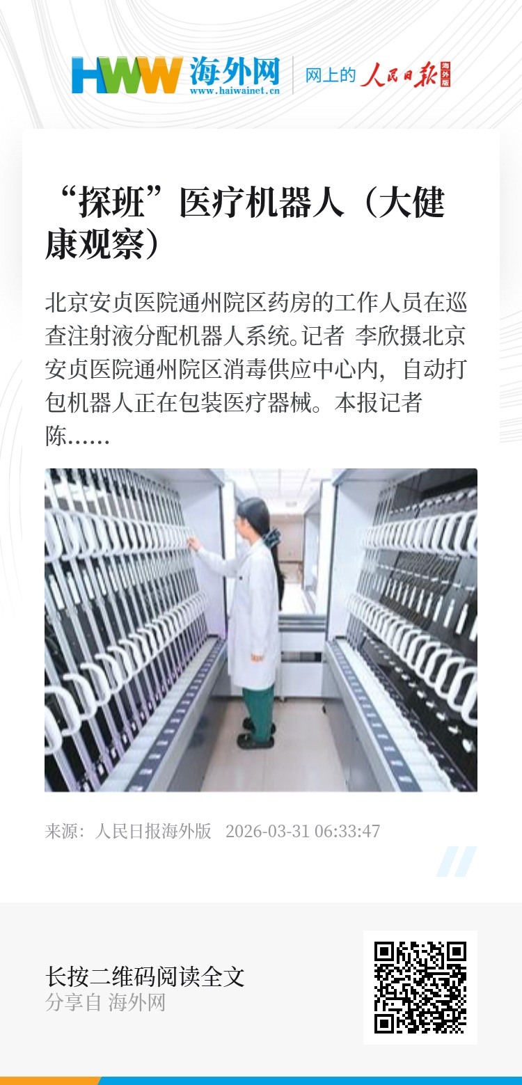 随着“机器人+医疗”深度融合,一批可复制、可推广的智慧医院建设模式将加快形成,持续推动我国医疗卫生事业高质量发展,让更多群众共享技术进步带来的健康红利。(记者 陈静文)
