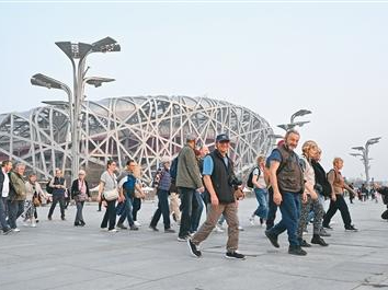 北京通过精准文旅推介和特色文旅产品供给,推动入境游人次与消费增长。图为外国游客近日在北京鸟巢参观游玩。