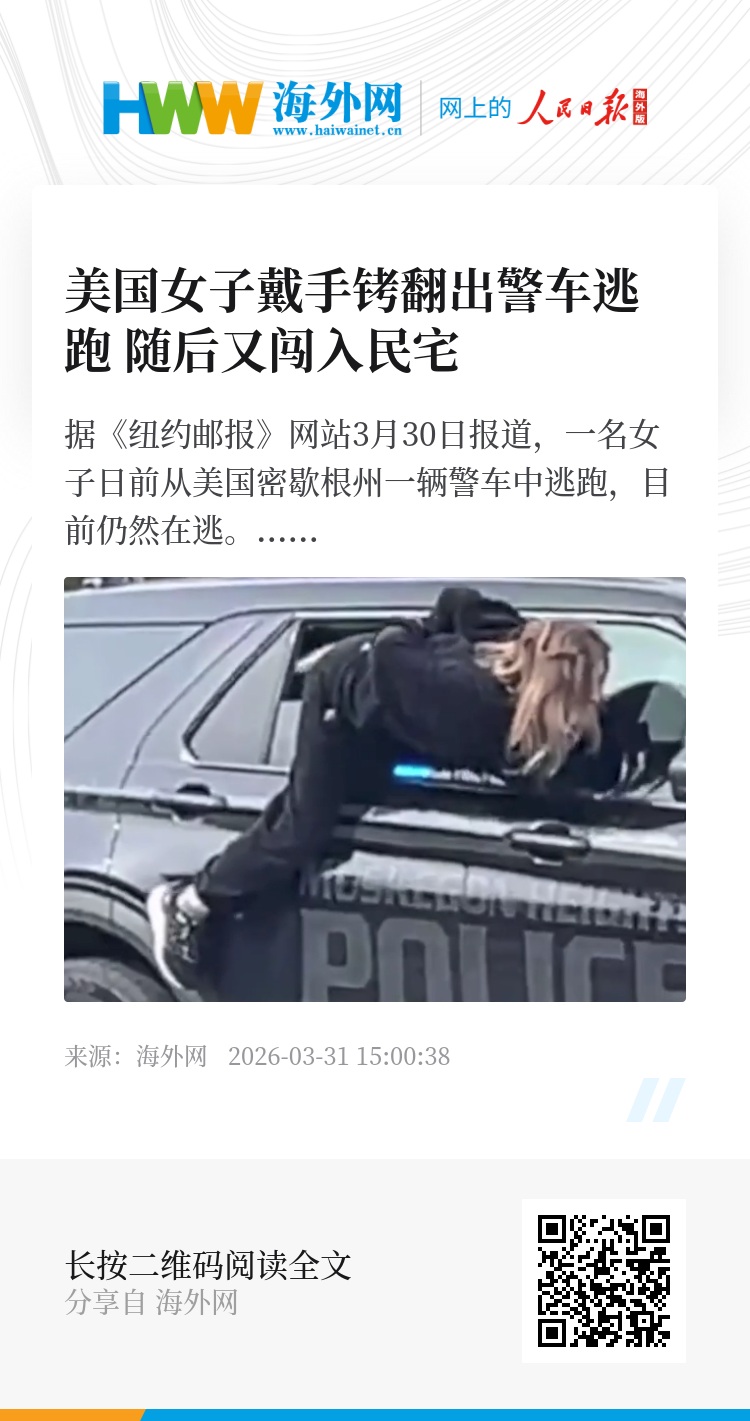 海外网3月31日电 据《纽约邮报》网站30日报道,一名女子日前从美国密歇根州一辆警车中逃跑,目前仍然在逃。