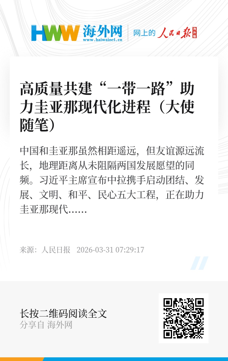 到任以来,我听到了许多关于中圭高质量共建“一带一路”的生动故事,也亲眼见证了双方合作的丰硕成果。阿里总统多次表示,共建“一带一路”契合圭亚那国家发展战略,为圭亚那现代化进程注入了重要动力。被中医治愈的一家三代人感慨:“中国医疗队是上帝送给圭亚那人民最好的礼物!”一位从中国留学归来的青年表示,将把在中国所学全部用于家乡建设。事实证明,高质量共建“一带一路”已在圭亚那扎下民心相通的根,结出互利共赢的果。中方将继续以第三份《中国对拉丁美洲和加勒比政策文件》为指引,同圭方携手推进五大工程,深挖高质量共建“一带一路”合作潜能,共享发展机遇,谱写中圭友好合作更加美好的新篇章。