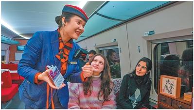 2月4日,在西延高铁西安北至延安的C8912次列车上,乘务员与外国友人互动。