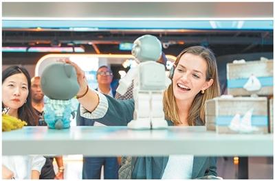 2025年9月16日,外国参观者在位于浙江杭州市的文三未来科技体验中心参观科技展品。