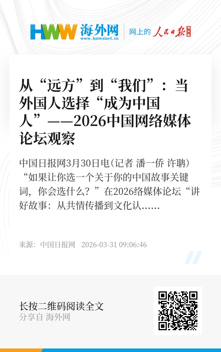 中国日报网3月30日电(记者 潘一侨 许聃) “如果让你选一个关于你的中国故事关键词,你会选什么?”在2026中国网络媒体论坛“讲好故事:从共情传播到文化认同”主题论坛现场,五位来自不同国家的外国友人给出了五个截然不同的答案:远方、爱、神秘、温暖和坚持。这五个关键词,串联起五个跨越山海的中国故事,也折射出当代国际传播中“成为中国人”这一独特现象的深层逻辑。