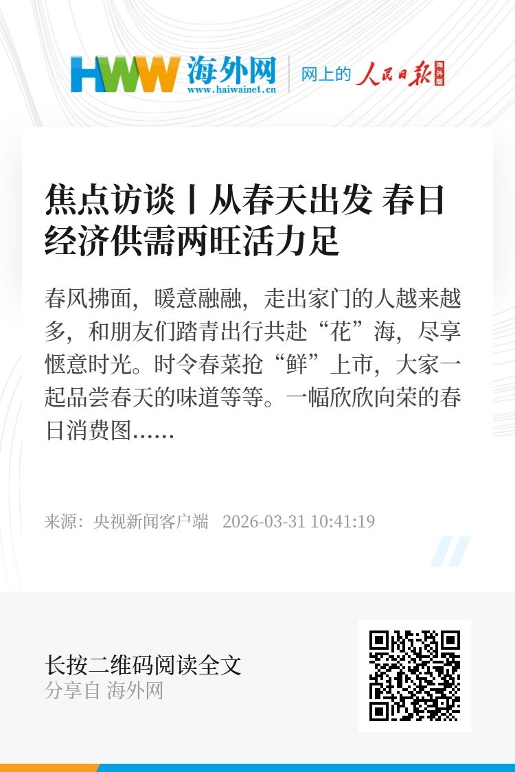 春风拂面,暖意融融,走出家门的人越来越多,和朋友们踏青出行共赴“花”海,尽享惬意时光。时令春菜抢“鲜”上市,大家一起品尝春天的味道等等。一幅欣欣向荣的春日消费图景正在铺展开来。从文旅体验到乡村休闲,从品质生活到绿色消费,多元业态蓬勃生长,烟火气与新鲜感交织,春日经济供需两旺、活力十足。