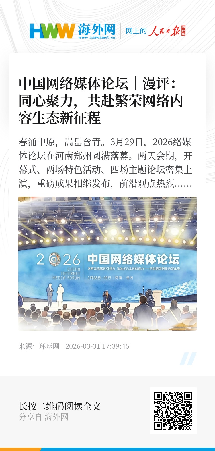 大河安澜,奔流不息。从回望十年蝶变到展望“十五五”新程,2026中国网络媒体论坛以其对叙事创新、生态培育与技术赋能的前瞻布局,为新时代网络内容建设绘制了清晰的施工图。当每一次点击都能触发共情,每一次创作都能获得滋养,每一次技术应用都能坚守向善,一个“正能量充沛、主旋律高昂”的繁荣网络内容生态必将加速形成,为网络强国和文化强国建设注入不竭的数字化动力。(泰轩萍)