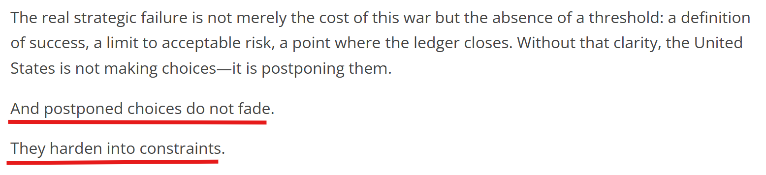 文章最后指出,真正的战略失败不仅在于战争代价,更在于缺乏明显的阈值:定义成功的标准、可接受风险的限度、结算时点的划定。缺乏这种清晰性,美国就不是在做出选择,而是在拖延选择。而拖延的选择从不会消失,它们只会固化为枷锁。
