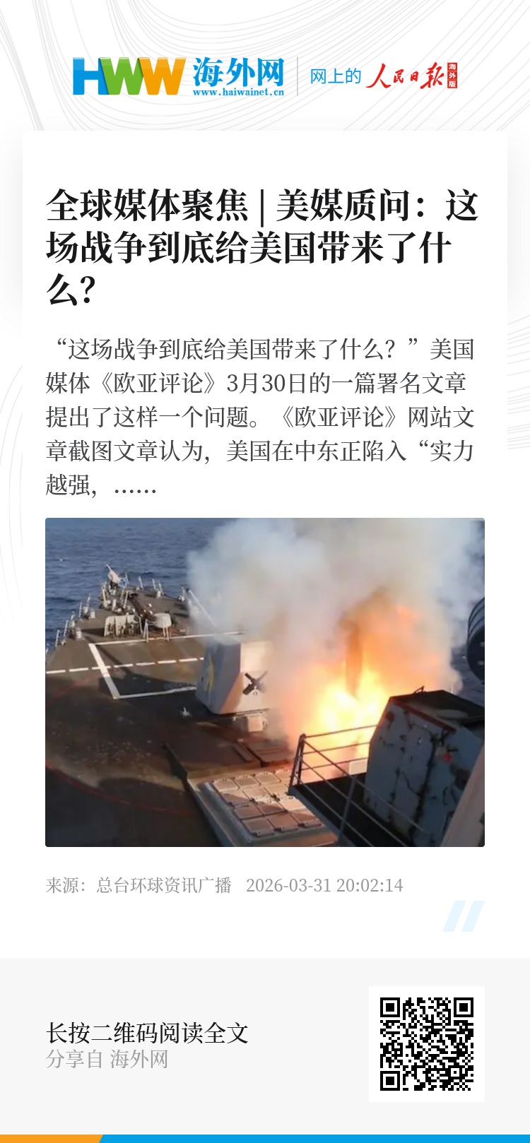 文章认为,美国在中东正陷入“实力越强,掌控越弱”的战略困境,正以巨大代价换取一场没有明确终点的战争。