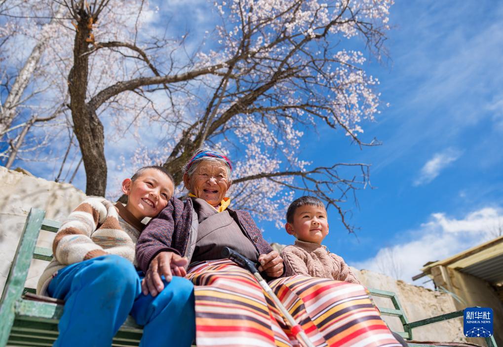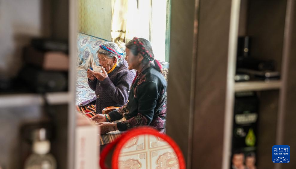 次仁桑姆(中)和两位晚辈在宗卡村家中的院子里聊天(3月26日摄)。