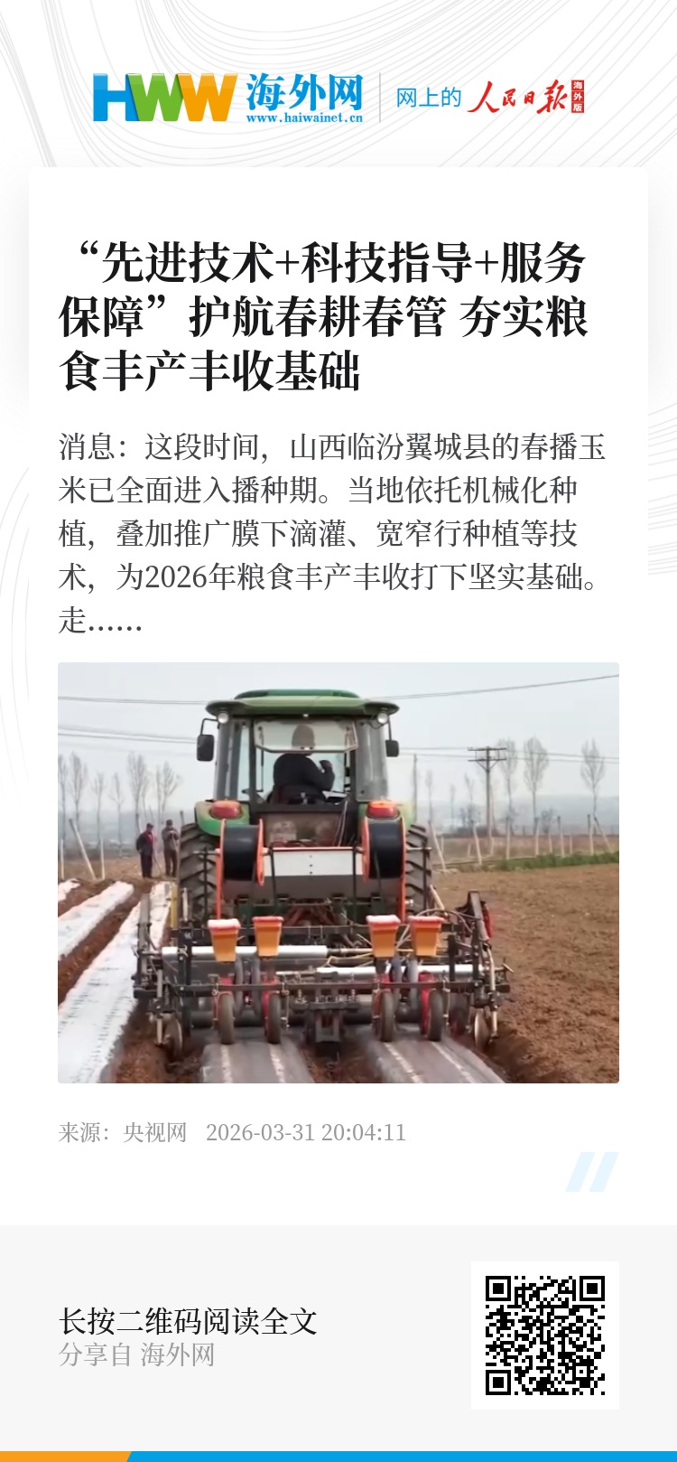 央视网消息:这段时间,山西临汾翼城县的春播玉米已全面进入播种期。当地依托机械化种植,叠加推广膜下滴灌、宽窄行种植等技术,为2026年粮食丰产丰收打下坚实基础。