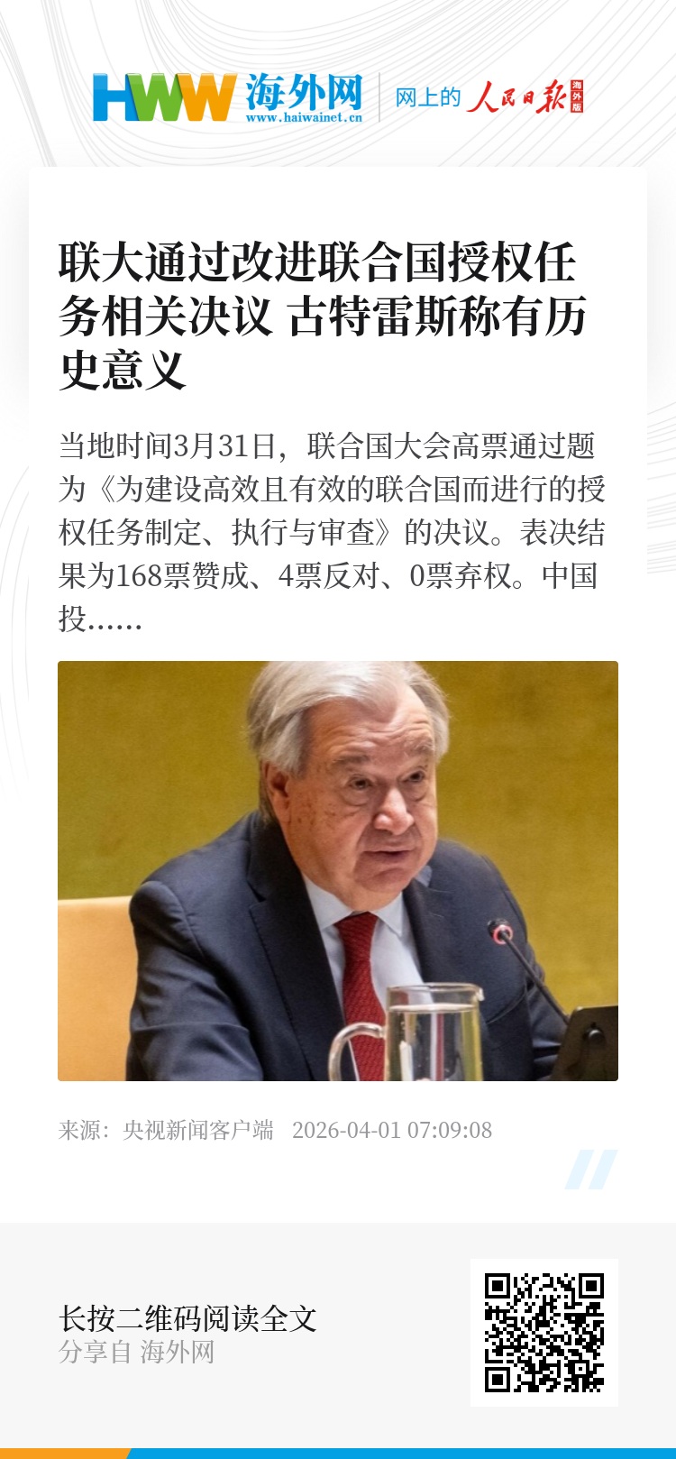 当地时间3月31日,联合国大会高票通过题为《为建设高效且有效的联合国而进行的授权任务制定、执行与审查》的决议。表决结果为168票赞成、4票反对、0票弃权。中国投下赞成票,俄罗斯、白俄罗斯、朝鲜和尼加拉瓜投了反对票。