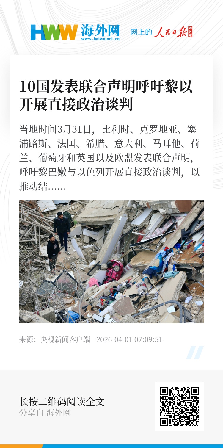 当地时间3月31日,比利时、克罗地亚、塞浦路斯、法国、希腊、意大利、马耳他、荷兰、葡萄牙和英国以及欧盟发表联合声明,呼吁黎巴嫩与以色列开展直接政治谈判,以推动结束当前冲突。