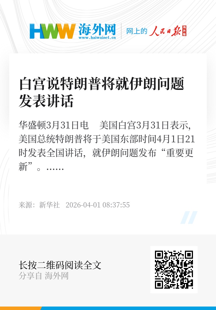 新华社华盛顿3月31日电 美国白宫3月31日表示,美国总统特朗普将于美国东部时间4月1日21时发表全国讲话,就伊朗问题发布“重要更新”。
