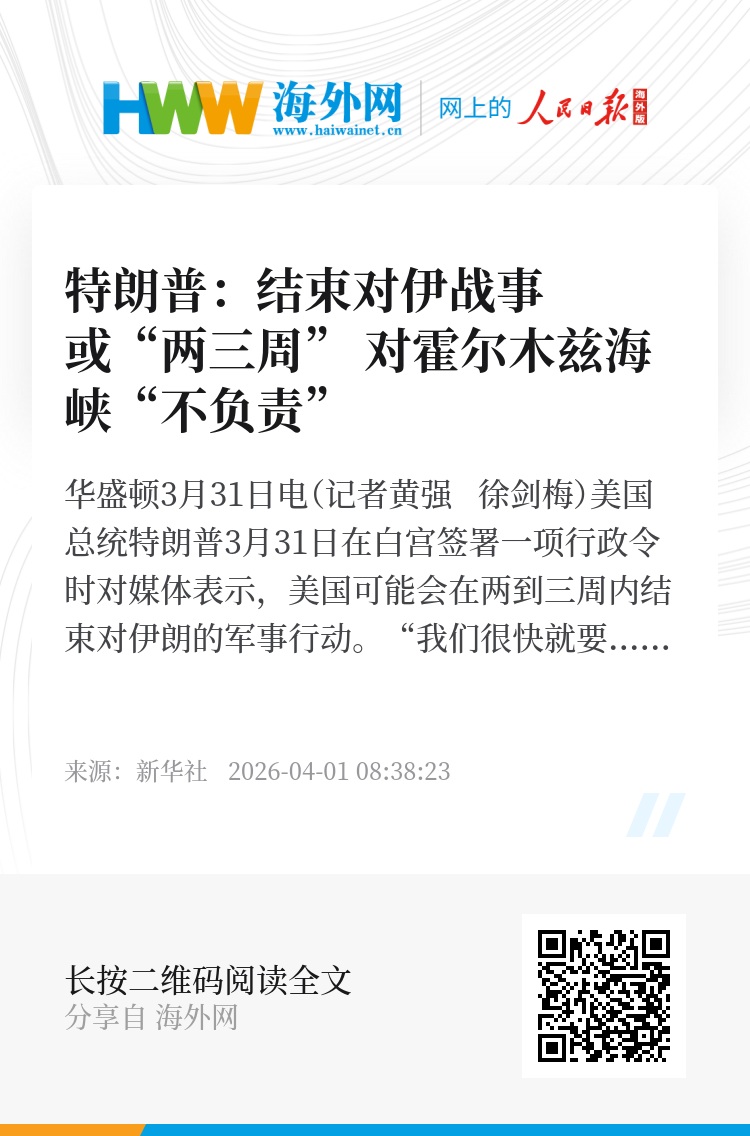 新华社华盛顿3月31日电(记者黄强 徐剑梅)美国总统特朗普3月31日在白宫签署一项行政令时对媒体表示,美国可能会在两到三周内结束对伊朗的军事行动。