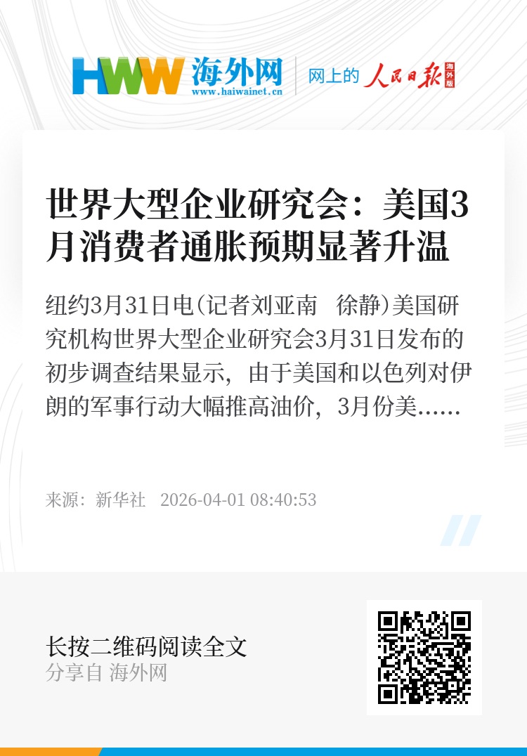 新华社纽约3月31日电(记者刘亚南 徐静)美国研究机构世界大型企业研究会3月31日发布的初步调查结果显示,由于美国和以色列对伊朗的军事行动大幅推高油价,3月份美国消费者对12个月后通胀预期显著升温。