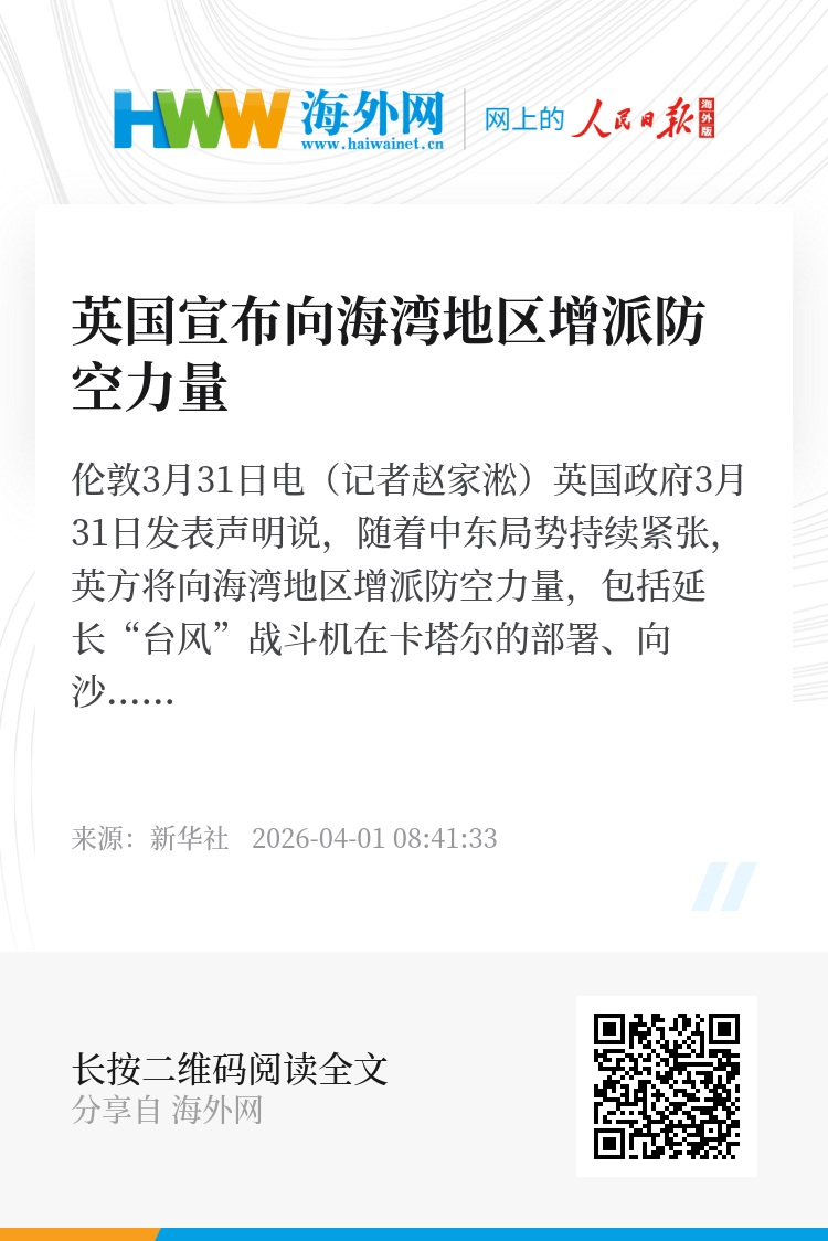 新华社伦敦3月31日电(记者赵家淞)英国政府3月31日发表声明说,随着中东局势持续紧张,英方将向海湾地区增派防空力量,包括延长“台风”战斗机在卡塔尔的部署、向沙特阿拉伯部署“天剑”防空系统。