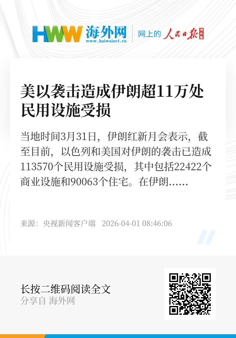 当地时间3月31日,伊朗红新月会表示,截至目前,以色列和美国对伊朗的袭击已造成113570个民用设施受损,其中包括22422个商业设施和90063个住宅。在伊朗首都德黑兰,有44391个住宅和商业设施遭到袭击。