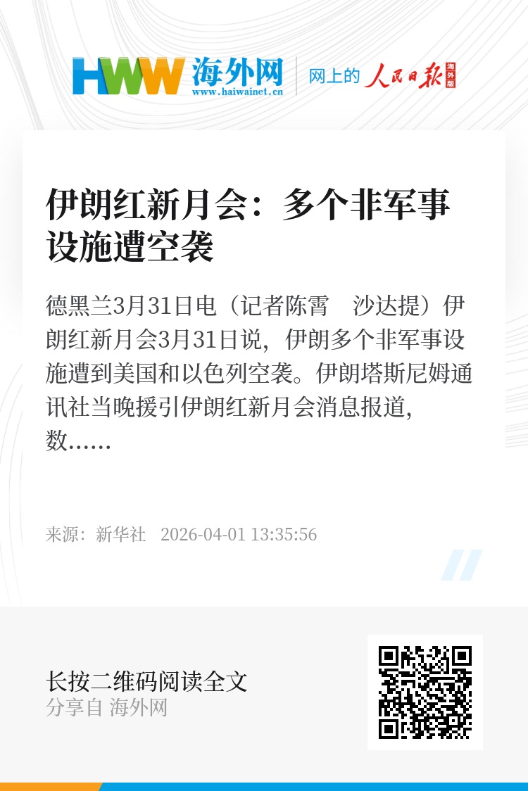 新华社德黑兰3月31日电(记者陈霄 沙达提)伊朗红新月会3月31日说,伊朗多个非军事设施遭到美国和以色列空袭。