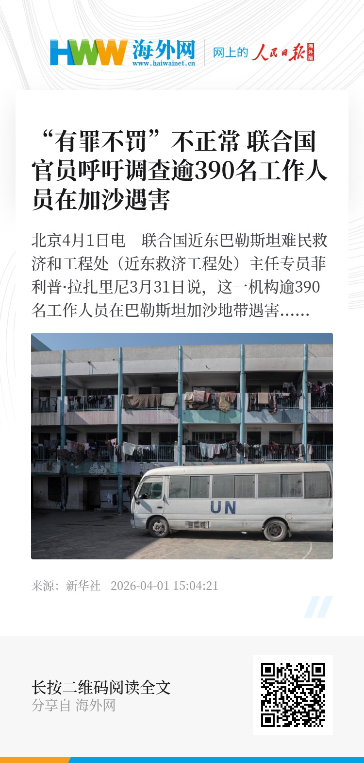 新华社北京4月1日电 联合国近东巴勒斯坦难民救济和工程处(近东救济工程处)主任专员菲利普·拉扎里尼3月31日说,这一机构逾390名工作人员在巴勒斯坦加沙地带遇害,他已向联合国秘书长及联合国会员国提出调查请求。
