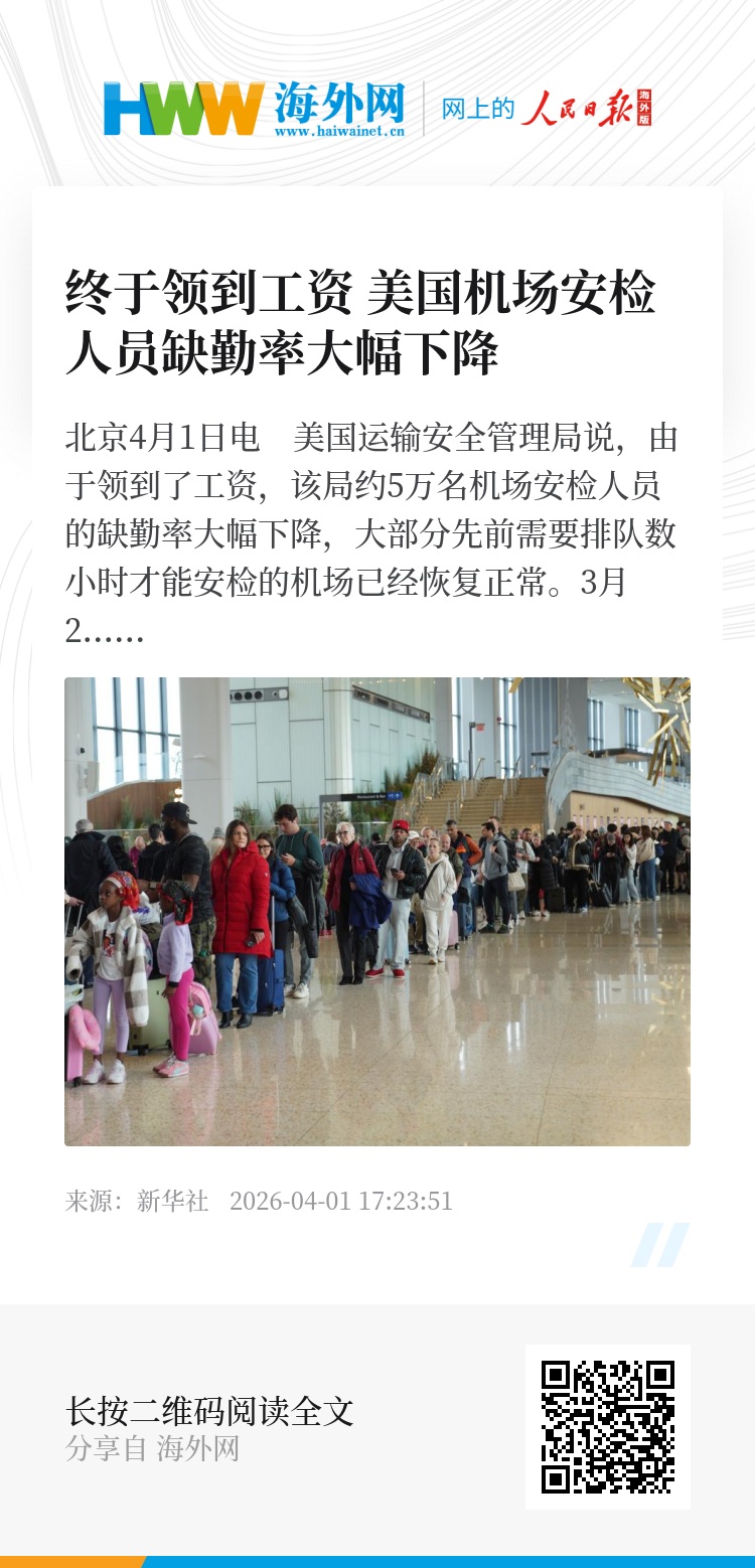 新华社北京4月1日电 美国运输安全管理局说,由于领到了工资,该局约5万名机场安检人员的缺勤率大幅下降,大部分先前需要排队数小时才能安检的机场已经恢复正常。