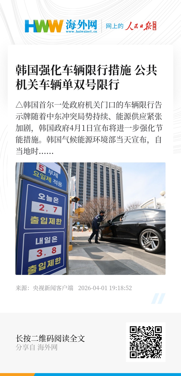 随着中东冲突局势持续、能源供应紧张加剧,韩国政府4月1日宣布将进一步强化节能措施。韩国气候能源环境部当天宣布,自当地时间4月8日起,公共机关车辆限行将由原先的工作日“尾号限行”升级为更严格的“单双号限行”,民间车辆虽仍维持自愿限行,但在全国约3万个公共停车场将被强制实施尾号限行措施。