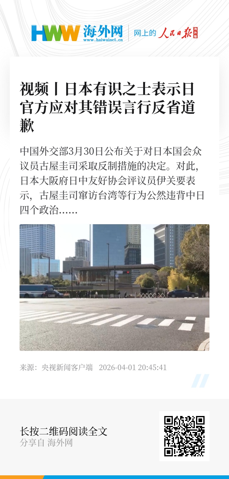 中国外交部3月30日公布关于对日本国会众议员古屋圭司采取反制措施的决定。对此,日本大阪府日中友好协会评议员伊关要表示,古屋圭司窜访台湾等行为公然违背中日四个政治文件精神,中方采取反制措施合情合法。他认为,日本官方应就近期的一系列错误言行反省道歉。