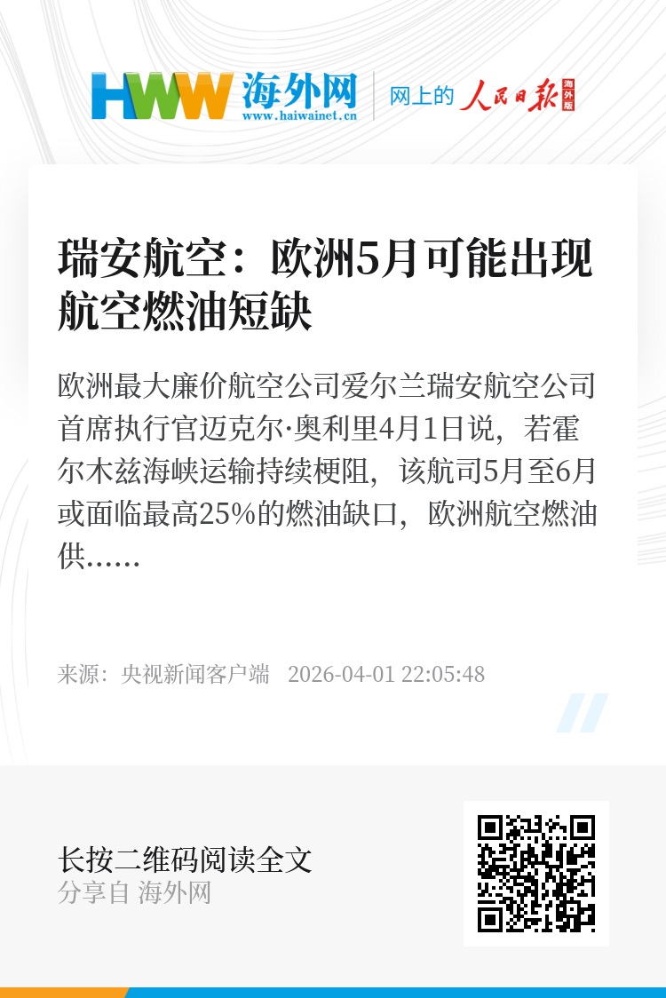奥利里当天接受采访时说,乐观估计,如果中东战事结束,霍尔木兹海峡在4月中下旬恢复通航,航空燃油供应无虞;但如果战火持续、海峡不通,瑞安航空将在5月至6月面临约10%至25%的航空燃油供应短缺风险,整个欧洲的航空燃油供应在5月份会出现紧张。