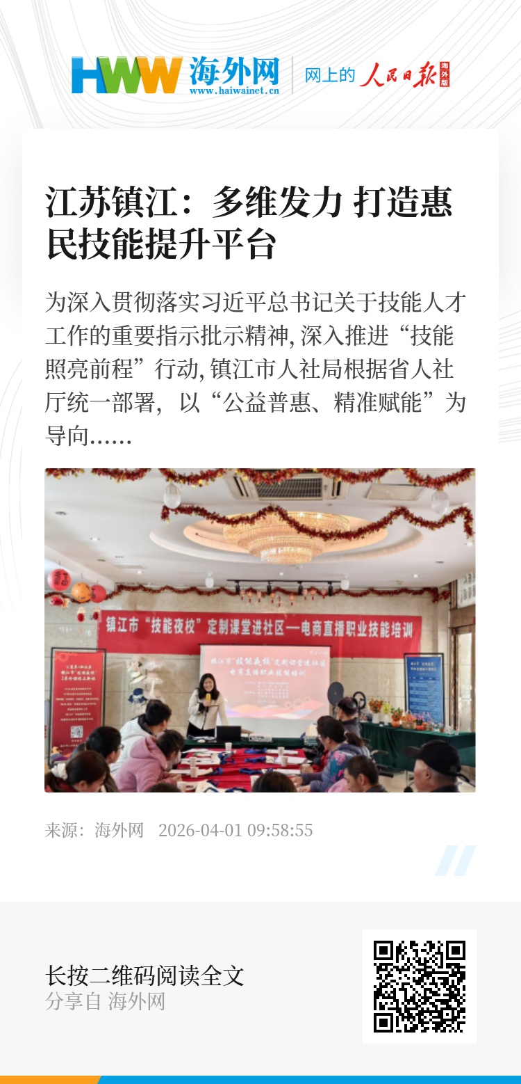 构建线上+线下、全媒体、广覆盖宣传矩阵,线上充分依托镇江发布、镇江人社、技能驿站、社区微信群等渠道,精准推送课程、师资、报名及流程,扩大宣传覆盖面和直达率;线下深入园区、企业、社区、校园开展政策宣讲、现场推介、成果展示等活动,面对面做好政策解读与服务引导。聚焦“技能夜校”惠民实效、特色做法、典型案例和学员成长故事,加大总结提炼和宣传推广力度,持续提升品牌知晓度、参与度和美誉度。大力弘扬劳模精神、劳动精神、工匠精神,引导全社会关心支持技能人才工作,营造“人人皆可成才、人人尽展其才”的良好社会风尚,为镇江产业强市和高质量发展提供坚实技能人才支撑。(唐靖棉、洪永明)