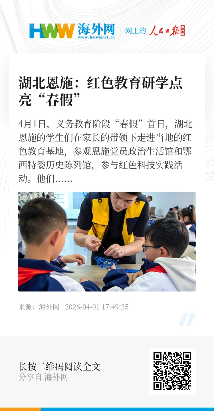 4月1日,义务教育阶段“春假”首日,湖北恩施的学生们在家长的带领下走进当地的红色教育基地,参观恩施党员政治生活馆和鄂西特委历史陈列馆,参与红色科技实践活动。他们与机器狗一起执行“战争”中的侦察、运输、搜救等任务,并动手DIY组装无人机模型,在沉浸式研学中感悟革命先辈的家国情怀与奉献精神,让红色基因与科学梦想在童心深处扎根。图源:视觉中国