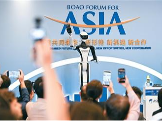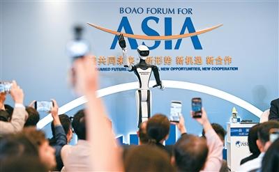 博鳌亚洲论坛二〇二六年年会期间,多元智能设备全方位护航盛会运行,以科技力量赋能智慧办会。图为在年会分论坛上参与互动的人形机器人。
