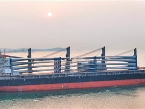 3月28日,7套国产风电设备在山东港口烟台港蓬莱港区完成装船并发往奥地利。随着中国风电企业不断拓展欧洲市场,烟台港目前已形成月均两班的欧洲风电设备发运频次。图为装载着出口奥地利风电设备的货轮从山东港口烟台港蓬莱港区起航(无人机照片)。