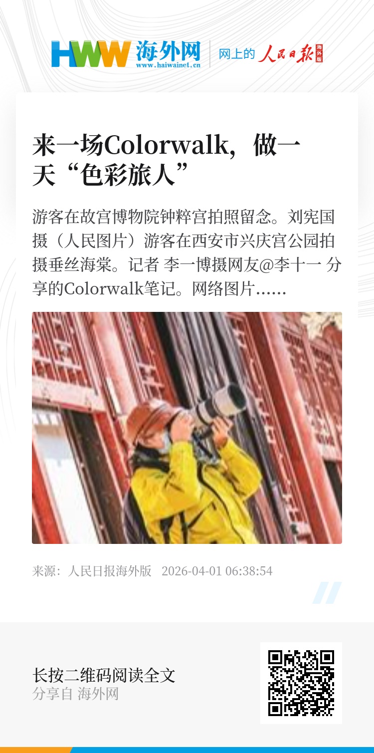 出门前选定一种颜色,以此为线索漫步街头,寻找一切与该颜色相关的事物,拍下照片,组合成一篇色彩日记——今年春天,这种名为“Colorwalk”(色彩漫步)的玩法在社交平台上兴起,迅速成为深受年轻人喜爱的春游新体验。在小红书上,Colorwalk相关话题浏览量超过2.1亿次,引发超过132万次讨论,网友们通过分享各自的色彩日记,交换不同地区的春光。
