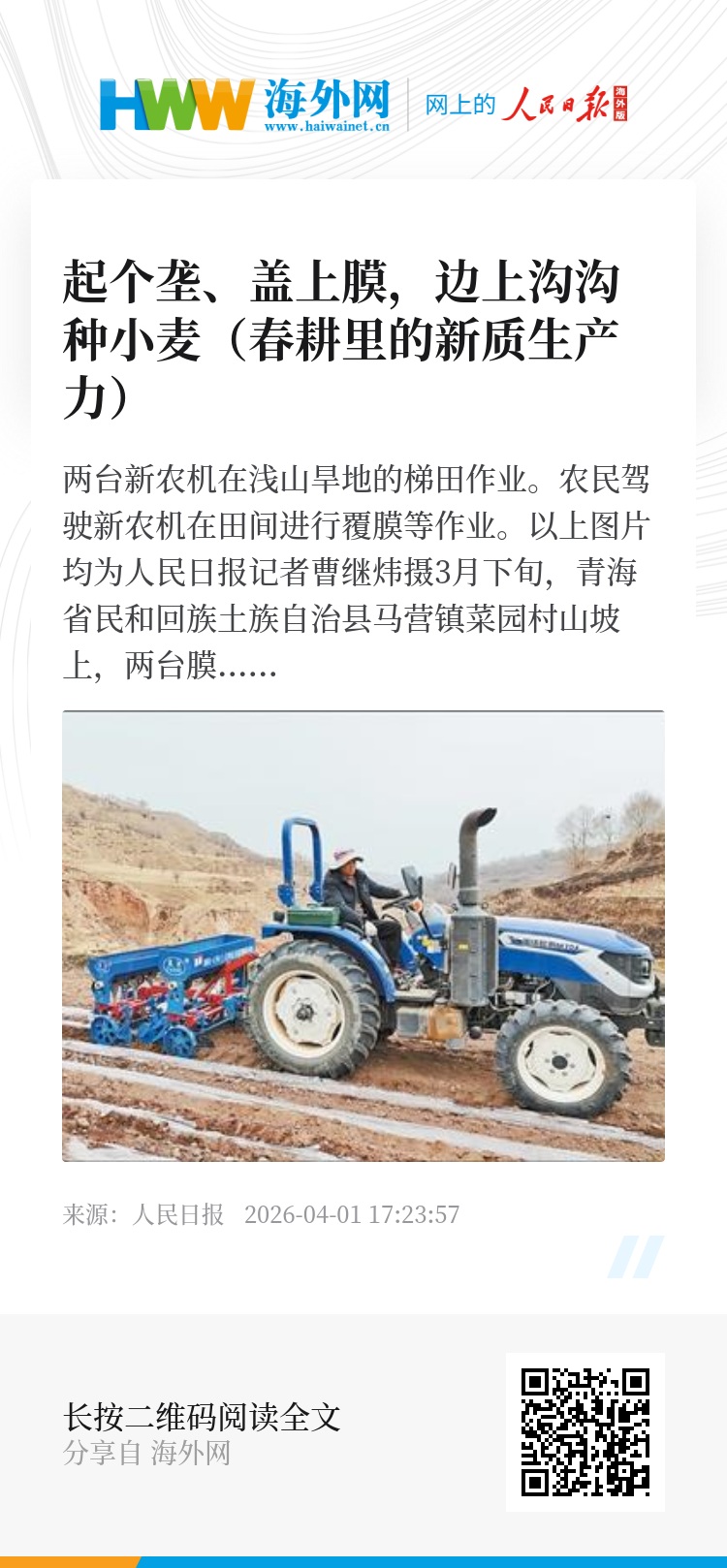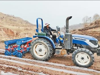 3月下旬,青海省民和回族土族自治县马营镇菜园村山坡上,两台膜侧小麦播种机灵活穿梭,田里铺满规整的地膜垄带。