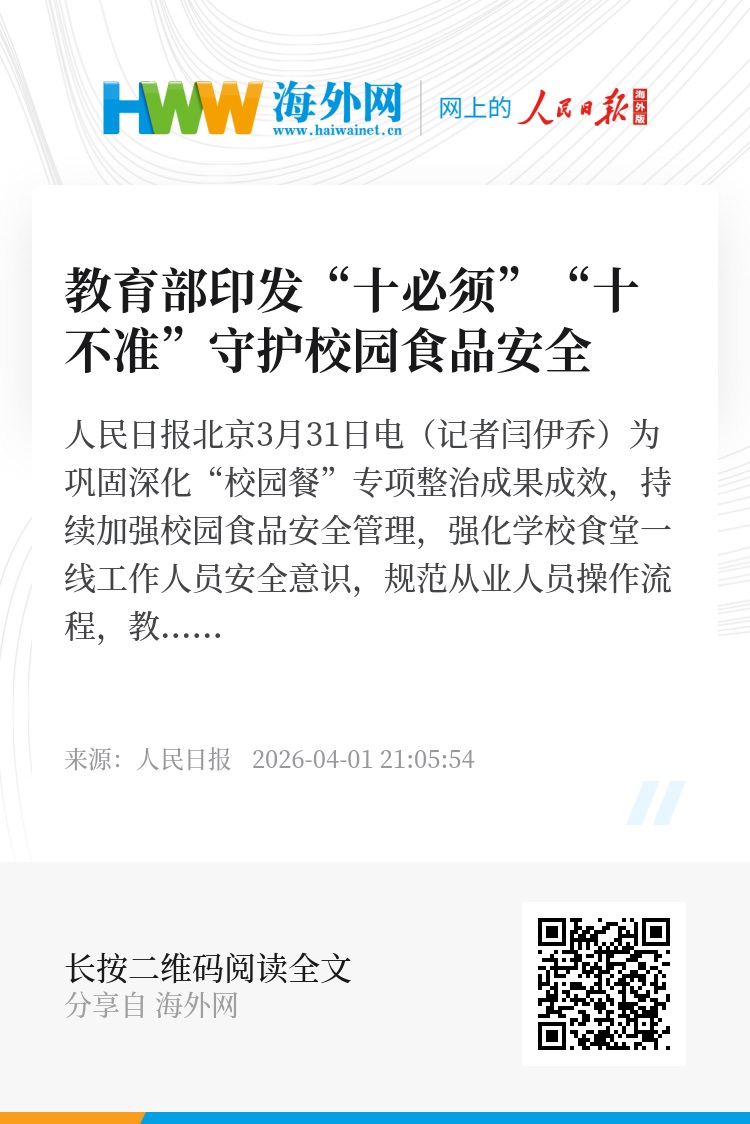 人民日报北京3月31日电(记者闫伊乔)为巩固深化“校园餐”专项整治成果成效,持续加强校园食品安全管理,强化学校食堂一线工作人员安全意识,规范从业人员操作流程,教育部办公厅近日印发了《校园食品安全“十必须”》《学校食堂工作人员“十不准”》,进一步筑牢校园食品安全防线,为孩子们的健康成长保驾护航。