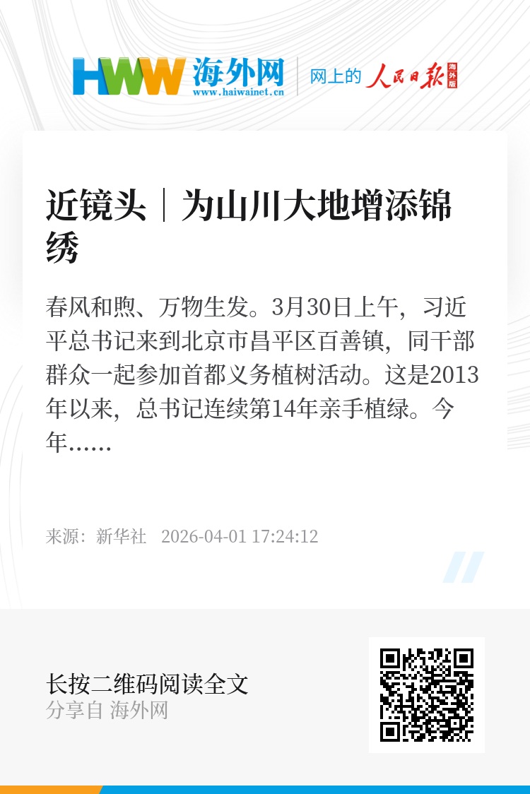 今年是“十五五”开局之年,也是全民义务植树运动开展45周年。习近平总书记强调,良好生态人人共享,也需要合力共建。要组织动员全社会广泛参与植树造林,为山川大地增添锦绣,让中国式现代化的底色更加亮丽。