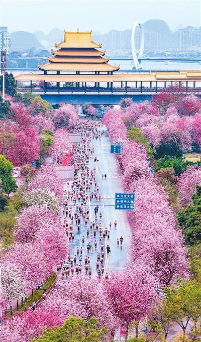 图为3月28日,柳州市举办全民跑活动,来自全国各地的1.8万名跑者踏上开满洋紫荆花的沿江赛道。