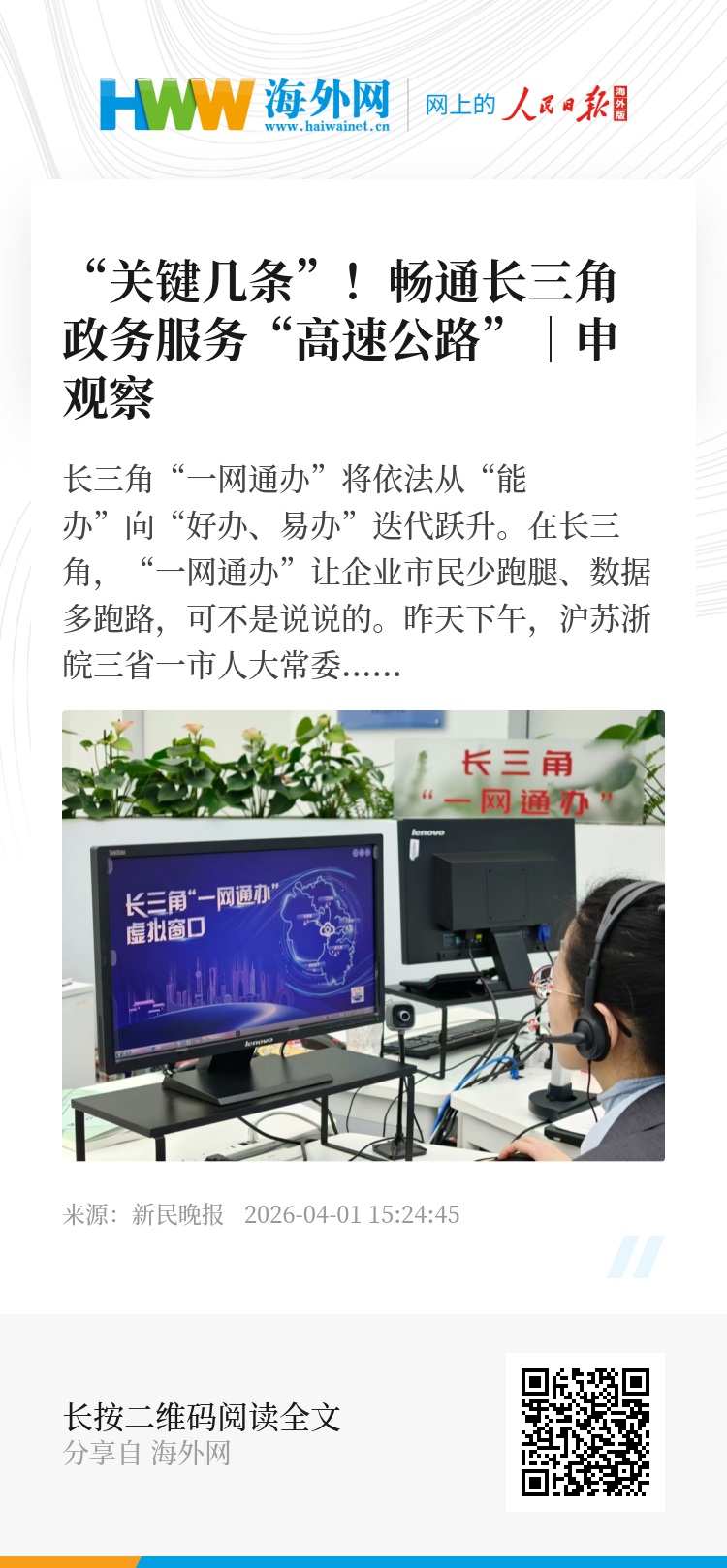 近年来,上海会同苏浙皖三省扎实推进长三角政务服务“一网通办”,这一平台已开通政务服务超 300 项,企业设立变更注销、新生儿出生“一件事”、长三角困难生教育资助“免申即享”等一批服务事项已落地见效。
