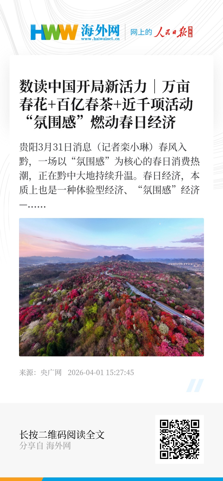 春风有信,发展有声。从万亩花海到一叶春茶,从近千项文旅活动到全链条消费,贵州以春日“氛围感”撬动大消费,以新场景激活新潜力,不仅为“十五五”开局之年注入了鲜活动能,更生动诠释了中国消费市场的强大韧性与无限活力。